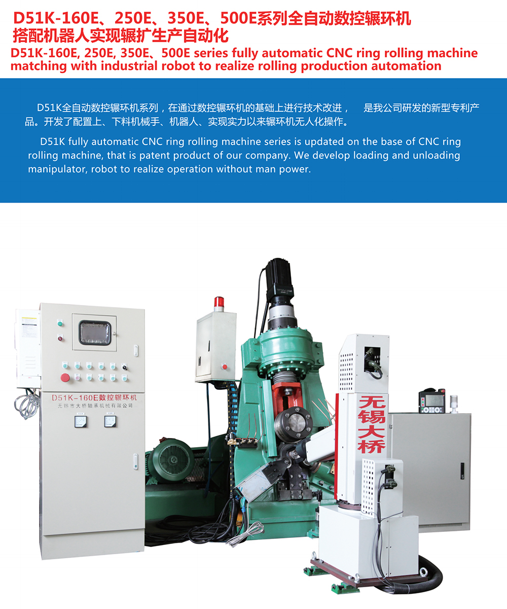D51K fully-automatic CNC ring rolling machine series is updated on the base of CNC ring rolling machine,that is patent product of our company.We develop loading and unloading manipulator,robot to realize operation without man power.